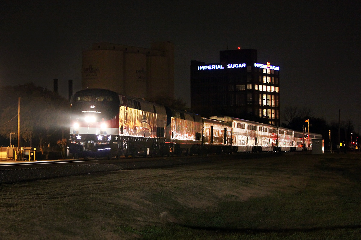 Amtrak’s P42DC 42 has finally made it through the Houston area. This is the locomotive that was recently re-painted into a special scheme recognizing our military veterans and their service. It’s a good-looking unit that I’ve been patiently waiting for an opportunity to photograph.