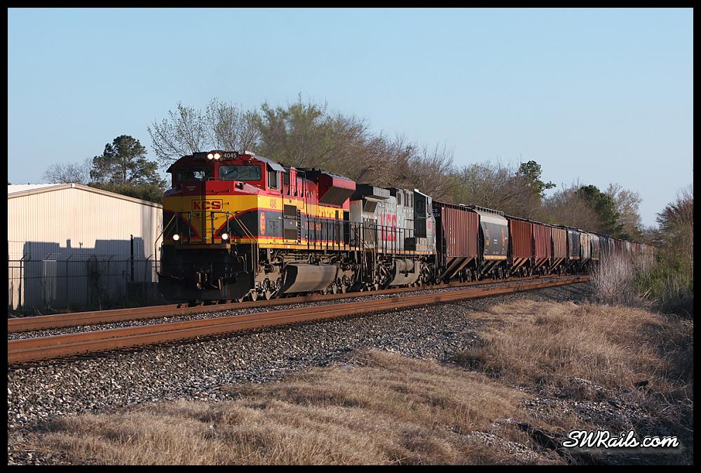 As I arrived to the Willowbend Drive grade crossing, the crossing gates activated. I bailed out of the car just in time to catch KCS 4045 at 6:44 PM leading empty grain train GMXKRJ. This was the second eastbound I referred to earlier.
