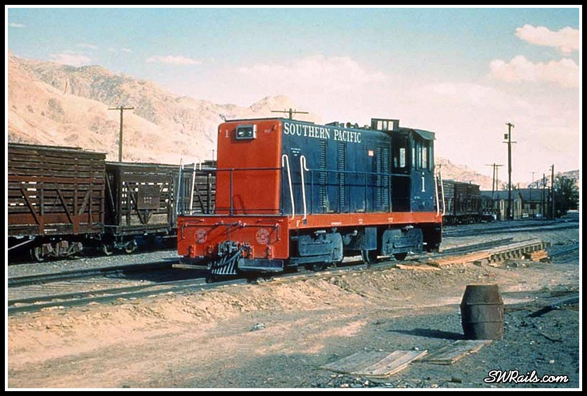 Alpha would be SP 1, a one-of-a-kind narrow-gauge General Electric locomotive. It was acquired by the SP in 1954 in order to dieselize its 3′ gauge Keeler branch. This branch, between Owenyo and Keeler, CA was the site of SP’s final steam revenue service in 1959, but that’s a different post.