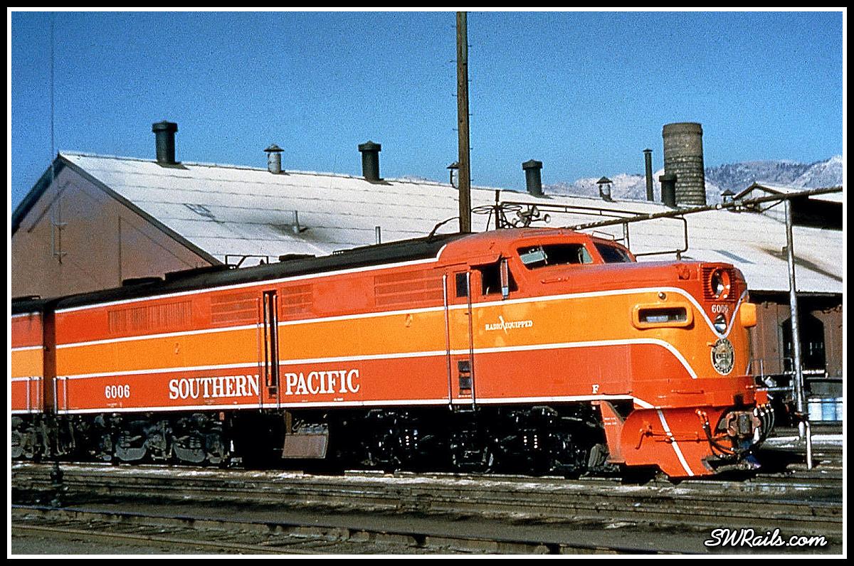 The Southern Pacific adopted the lark gray & scarlet locomotive paint scheme in 1959. The paint on the second image isn’t fresh, nor it weather-worn, allowing me to infer the date range.