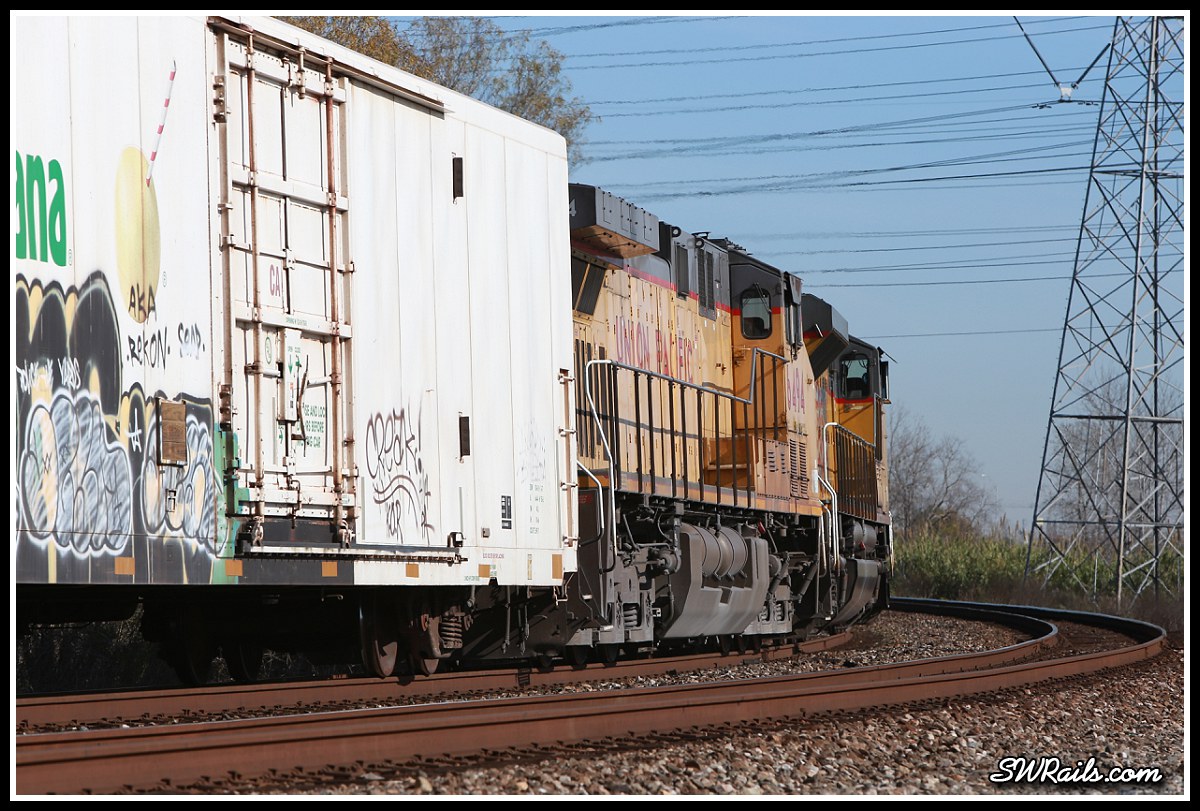 Minutes after Amtrak was UP 8587 leading UP’s hottest Glidden sub eastbound, the ZLAJX (expedited Los Angeles-Jackson, MS):