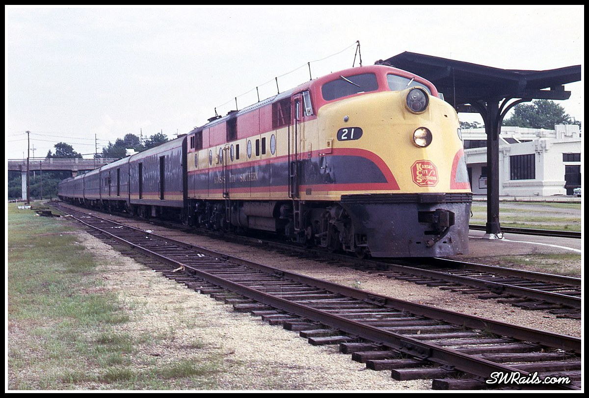 KCS E3A 21 was built 9/1938 as EMC 822, a demonstrator of EMC’s new-fangled diesel locomotives. KCS acquired it in 1939, and a sister unit, to inaugurate KCS’ foray into the streamliner business, the Southern Belle.