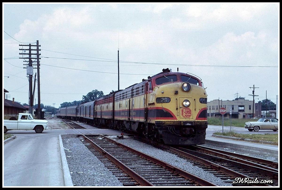 First up is a 6/18/1961 view of Train #2, the northbound Southern Belle at Joplin, MO. It’s led by E3A 21 which is notable for being the KCS’ first diesel locomotive.