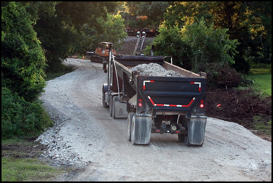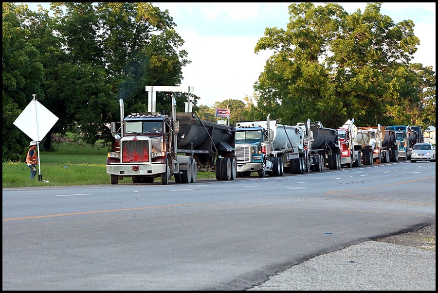 Before they can work on the bridge, they have to be able to get to it. They’ve cut a road through the trees and mud to provide access. This is the line of 18-wheelers waiting their turn to dump their loads of rock.