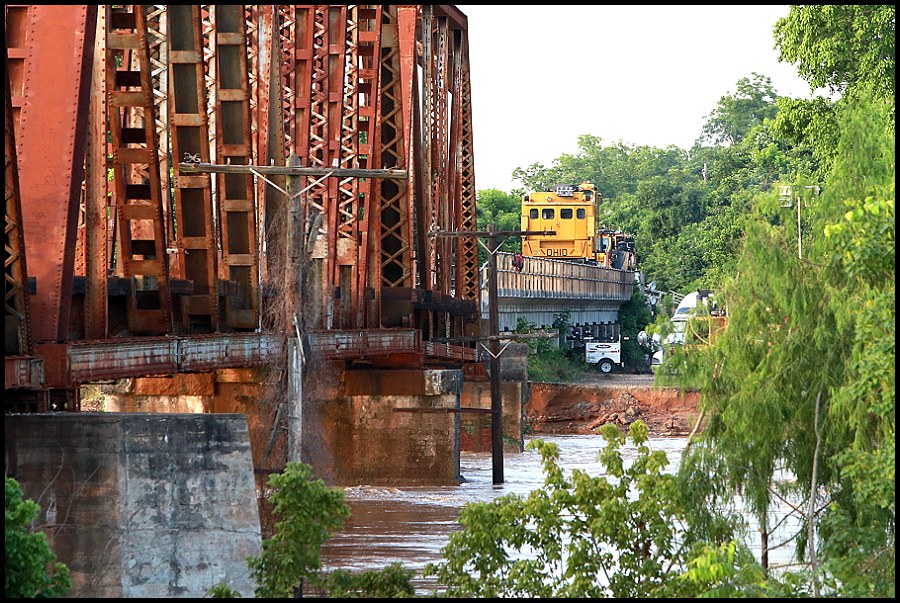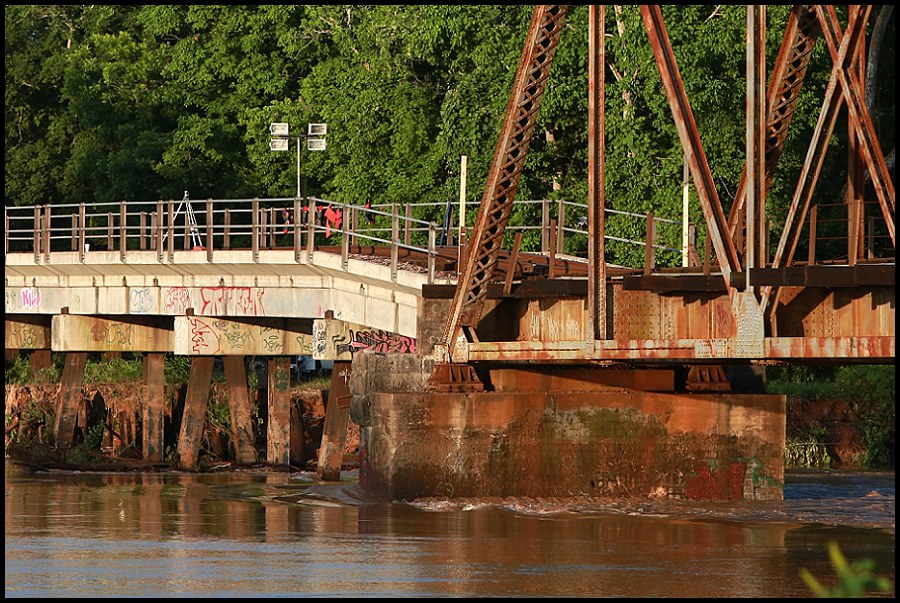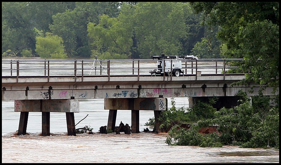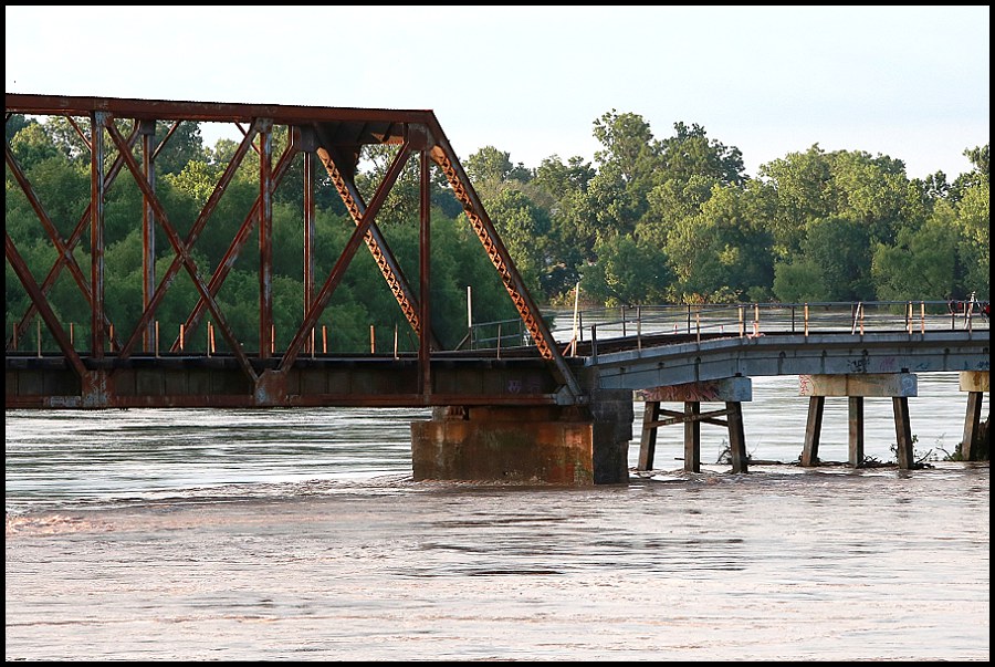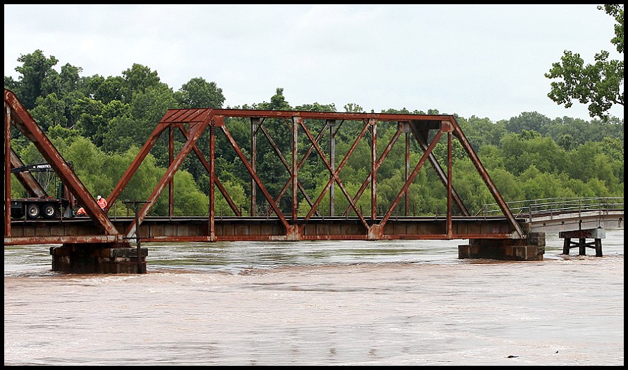 A tighter view of the east end of the bridge. The river is running about 40 feet higher than normal!