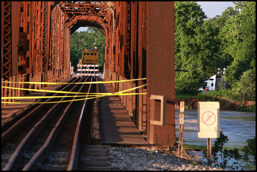 I assume the yellow tape is to provide a legal fig leaf should some miscreant venture across the bridge, stumble, and fall to a watery demise.