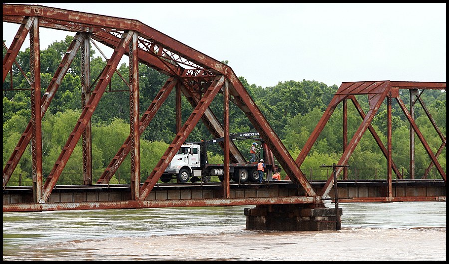 It’s clear that pier between the approach and the truss has settled 3-4 feet. What isn’t clear is the condition of the piers supporting the approach, to the extent they’ve been exposed to unprecedented water flows.