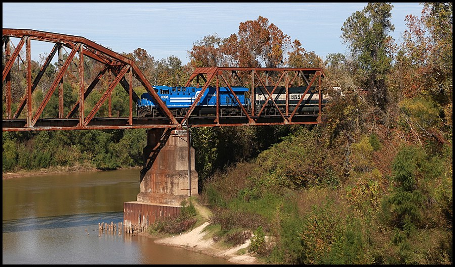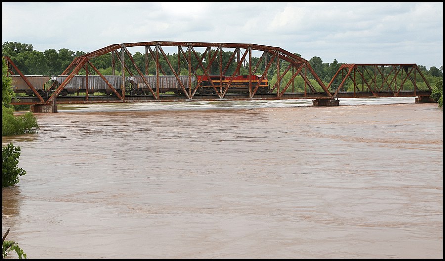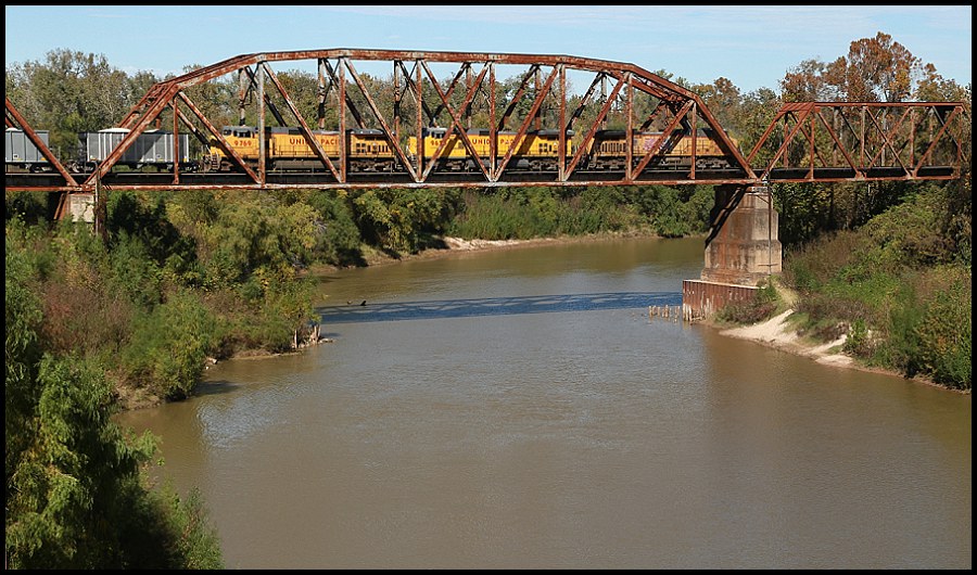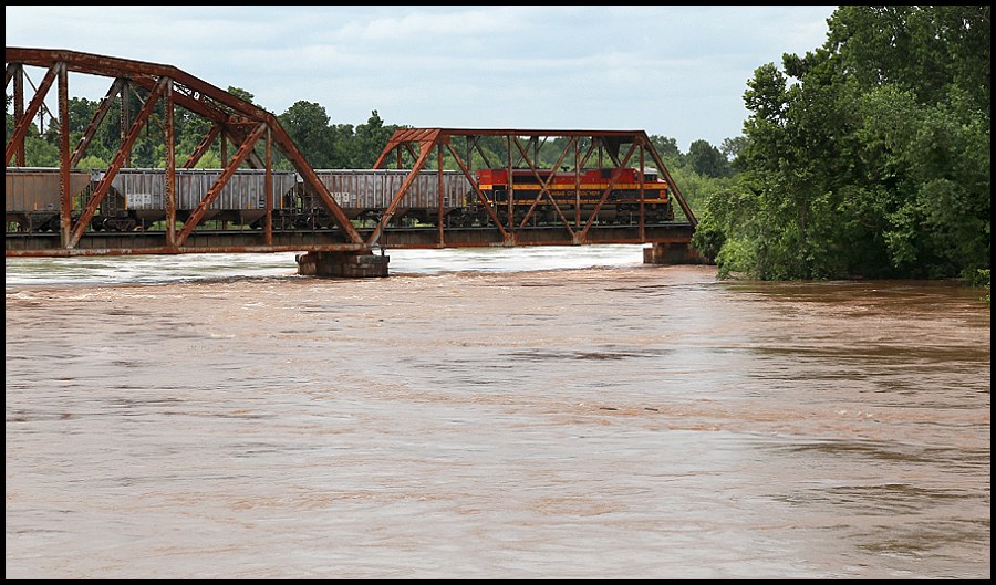 A KCS empty grain train proceeds east across the Brazos River bridge at Richmond, TX, near MP 32 of the Glidden sub, about 30 miles southwest of Houston, TX. Compare this first image to the second image, from 11/24/2014, showing the Brazos River under more typical conditions.