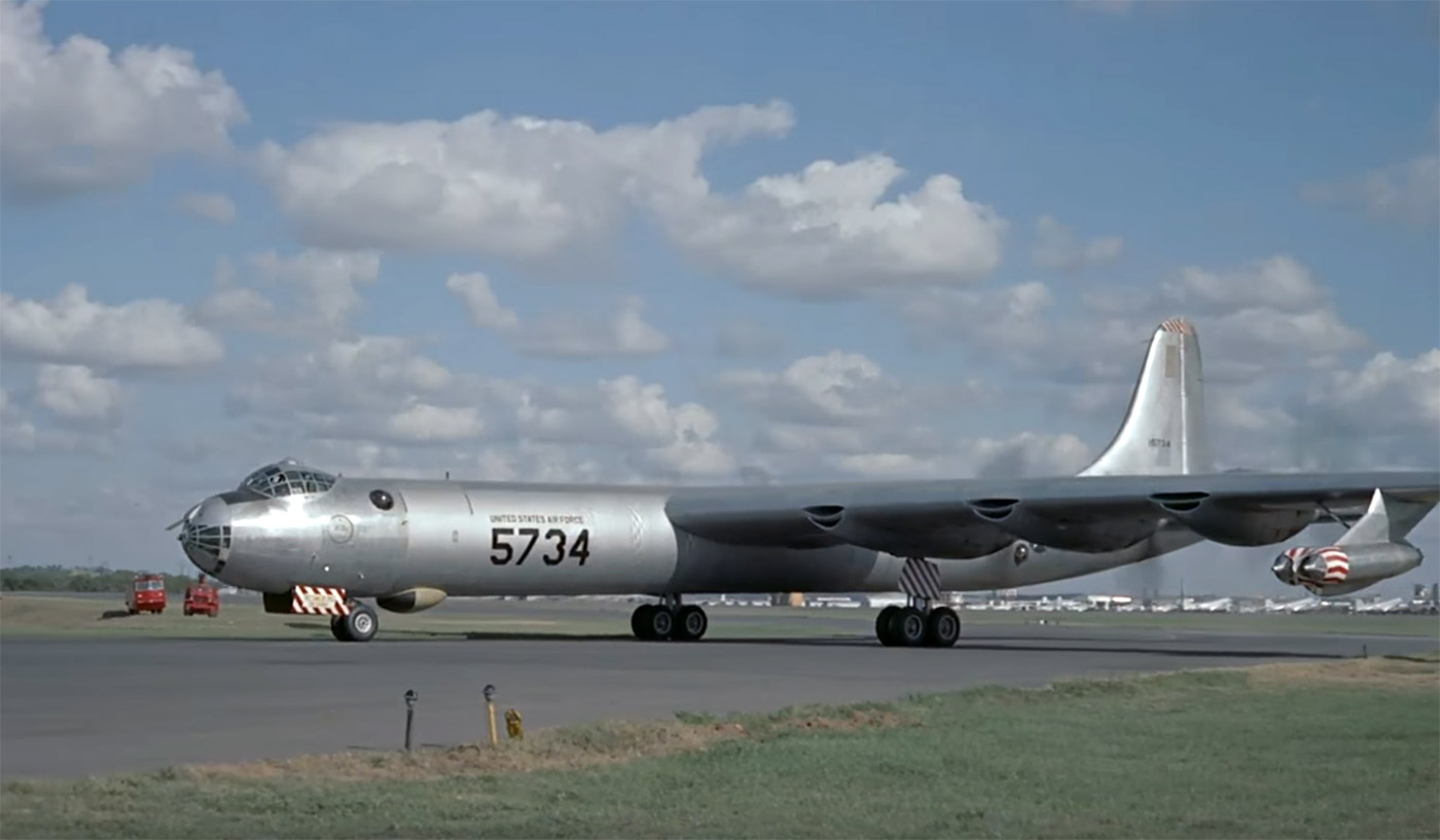But I’m not done gushing about this video. As soon as the video starts you’ll be treated to an “in your face” shot as the B-36 lines up to take off. About 1:50 into the video, you’ll see the aircraft roll and rotate from a camera aboard a B-25 that’s pacing the B-36. It’s just an amazing piece of work. To be fair, something like this is no big deal for the CGI crowd, but to be even more fair, this was shot “in real life!” I wonder how many takes were required to get this down right? During the height of the cold war, the U.S. military would go to great lengths to accommodate the filmmakers. I’m glad they did. (Make sure you play the video full screen)
