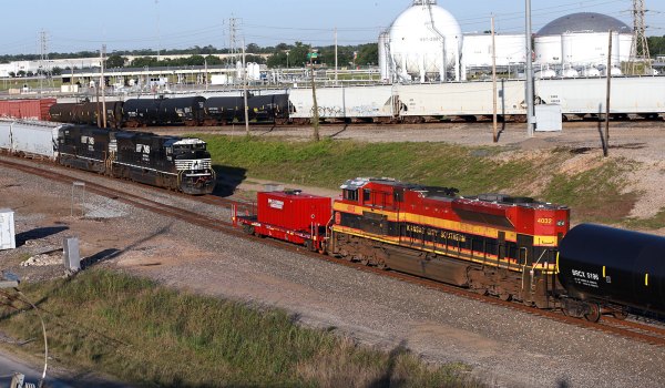 I got a chance to railfan in Houston this past May 5th. I was at the east end of UP’s Englewood Yard. I was waiting for a KCS manifest train to clear up so I could photograph a UP train that had an ex-UP SD9043MAC on the point. As the end of the KCS train came into view, I prepared to photograph the DPU.