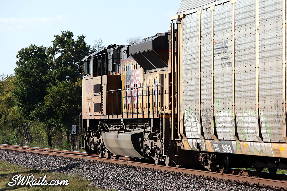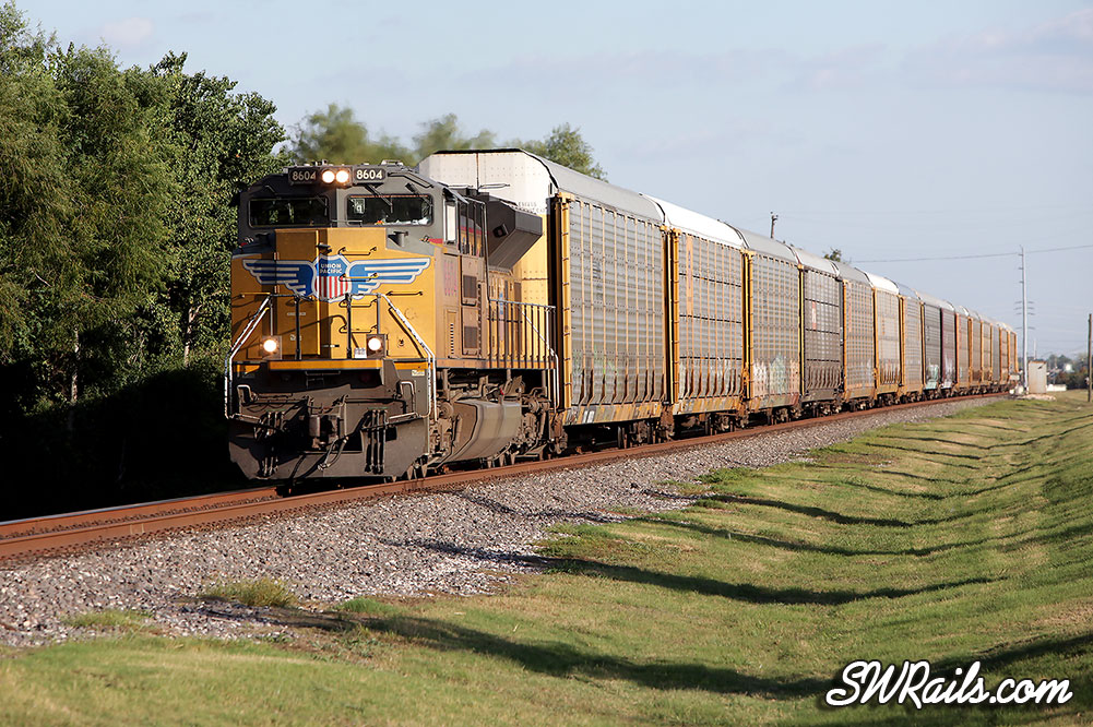 We got out of the house, took care of a few errands, and headed toward West Junction where I hoped to get my first shots of the train. En route, I heard the DS tell the MOW foreman at Heacker that UP 8408 would be the next train through their Form B . I set up for it between switches at Missouri City, catching the MEWEG-21 (Manifest Englewood – Eagle Pass) at 11:27 AM.