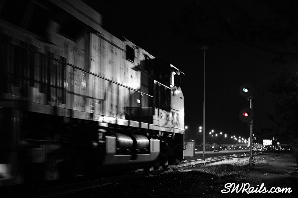 With the ISO set at 5600 with my 28-70 2.8 lens wide open, the best shutter speed I could get was 1/80th second, nowhere near fast enough to freeze the motion of the train. But it worked out nicely because the slow shutter speed nicely shows the motion of the train. The only thing I didn’t like was the color cast of the sodium arc lights on the lead engine, but I fixed that by converting the image to B&W, except the signals.