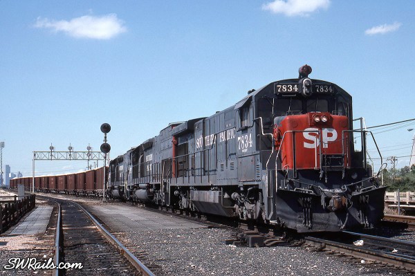 The second and fourth units are Tractive Effort Booster Units. Known as TEBU’s for short, the SP received 14 of these road slugs in 1980. They were re-built from retired U25B’s.