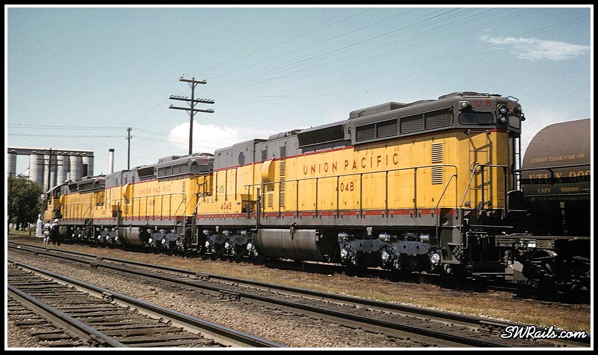 We’re in the little town of Schuyler, Nebraska, about 70 miles west of Omaha. UP had a small yard, or more correctly, a couple of sidings here. Two crewmen are on the ground alongside the brand-new A-B-B set of SD24’s that’s been assigned to their manifest train.