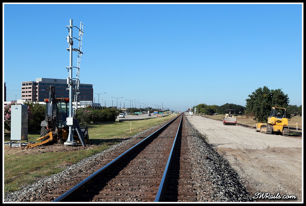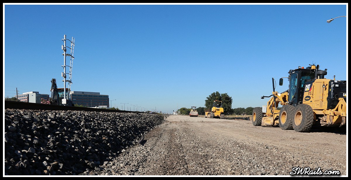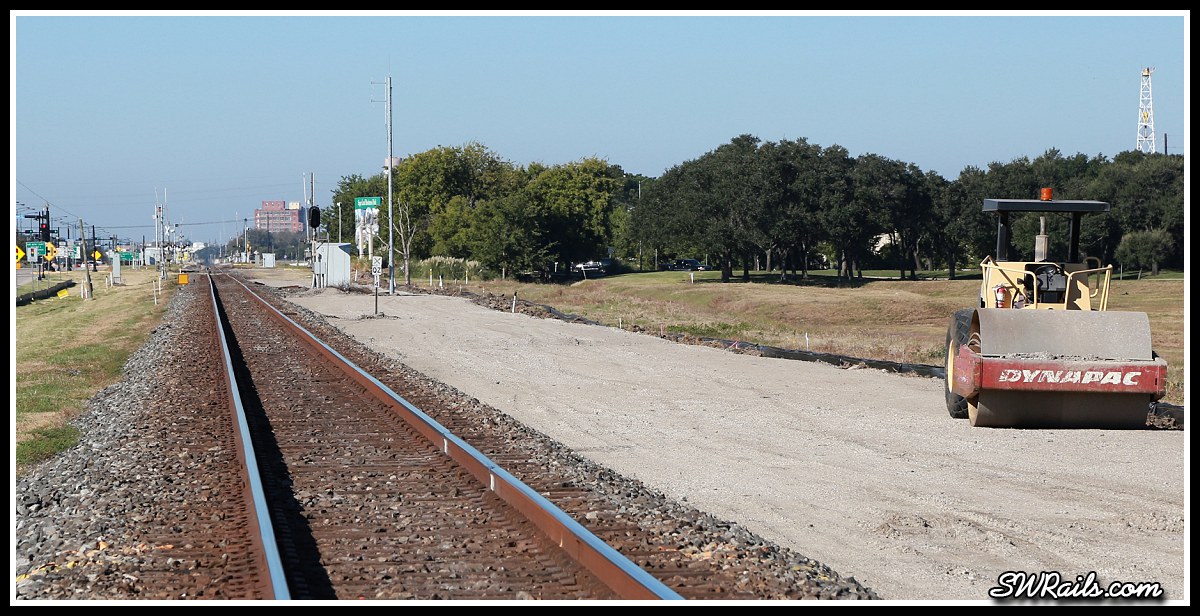 The dispatcher made reference to 2 eastbounds running behind Amtrak, but there’s time for a few shots of the MP 19 – MP 28 double-tracking project. All 3 views are looking west from MP 22.5. Note the old Imperial Sugar mill in the background of the first image.