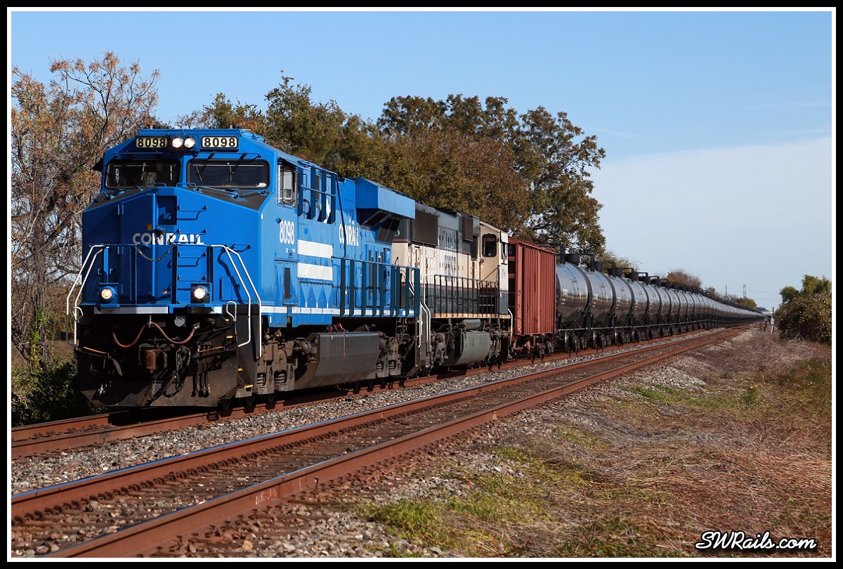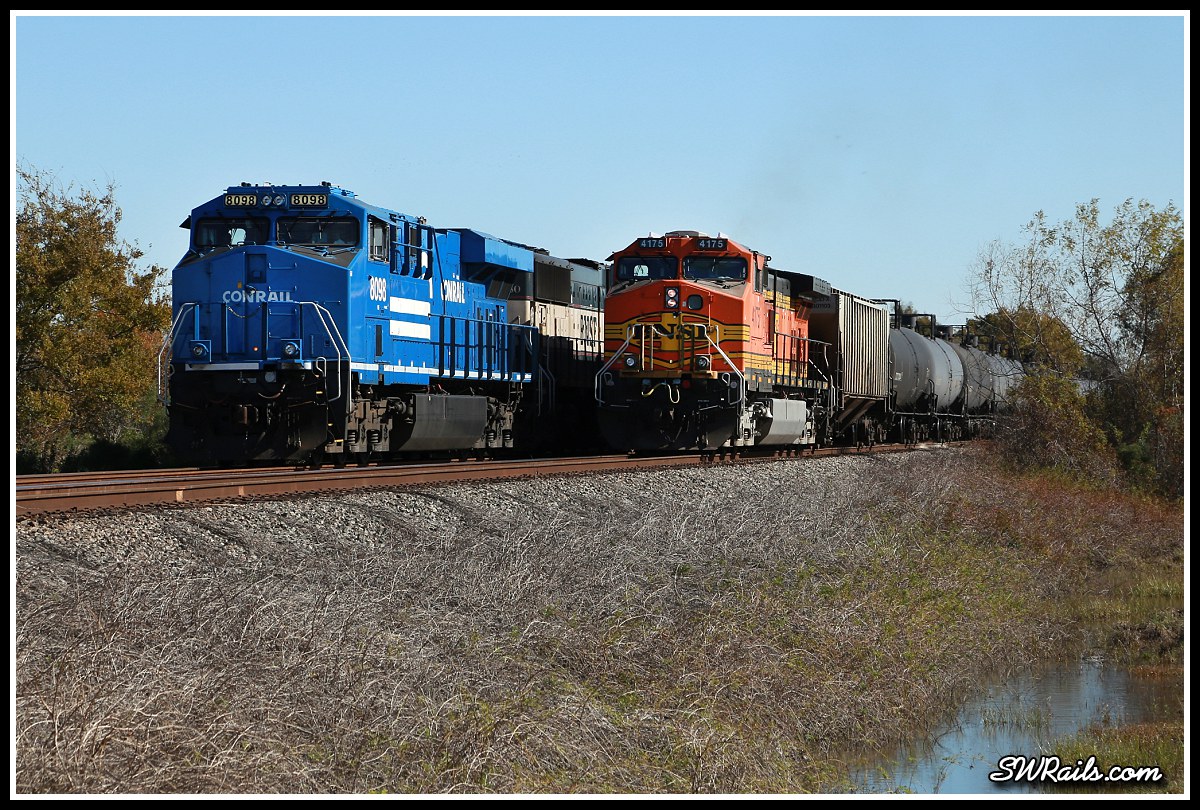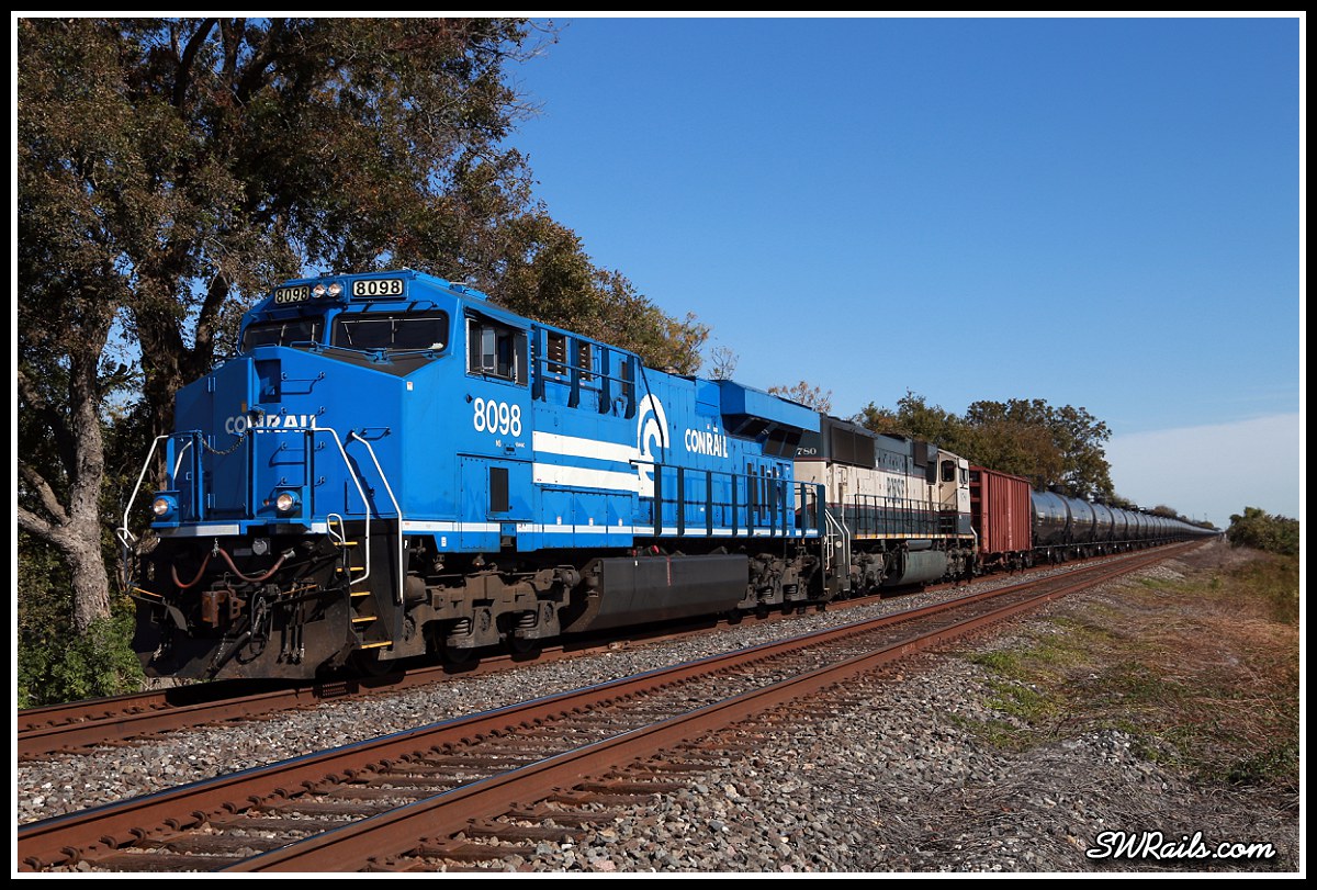 I decided to make my stand at the Hwy 6 grade crossing, near MP 25.5. But I got nailed by the traffic light at Hwy 6 and US 90, a mere 50 yards from my planned destination. Seconds later the crossing gates came down. Damn! But NS 8098 did look great as it went by me at a good 40mph. Double-damn!