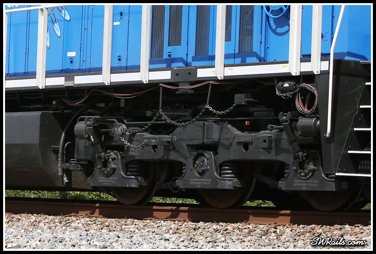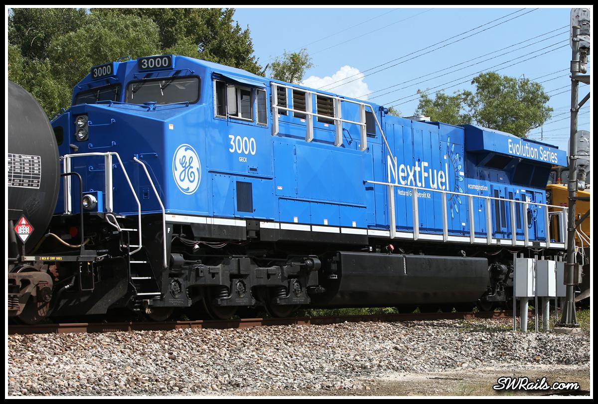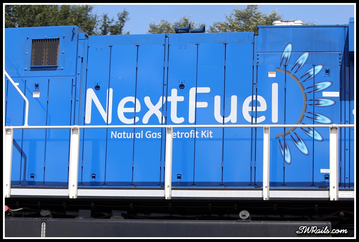 This unit is one of 2 test beds for GE’s NextFuel concept. This unit will test with BNSF ES44AC 5815 with an LNG fuel tender . BNSF has 2 cars for this testing, 933500 and 933501.