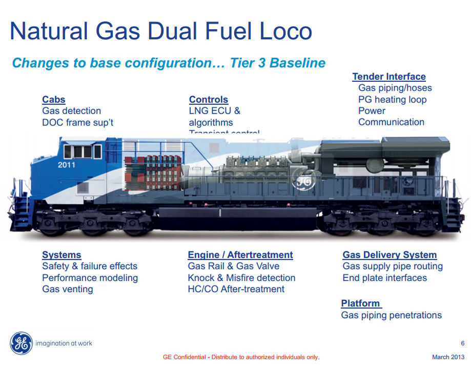 GE has been testing this low-pressure natural gas technology since spring of 2013, and is working closely with its Class 1 partners for further field testing. The use of liquid natural gas (LNG), which is cryogenically stored in a tender in the consist, provides enough fuel for a fully-loaded train to travel longer distances without refueling stops. An Evolution Series locomotive equipped with the NextFuel Natural Gas Retrofit Kit meets US EPA Tier 3 emission standards. A pilot program with the BNSF to test the use of natural gas as a fuel source for locomotives will proceed in 2014.